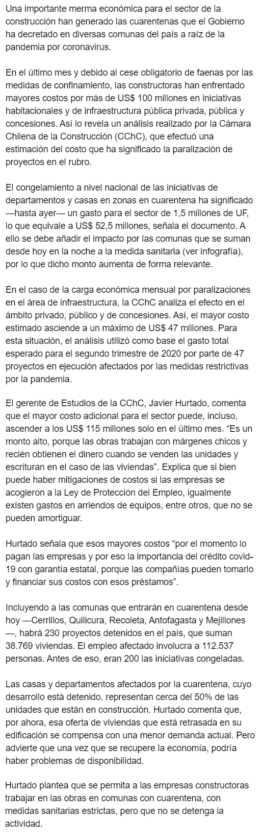 Costo de Paralización de obras por cuarentenas supera los US$ 100 millones