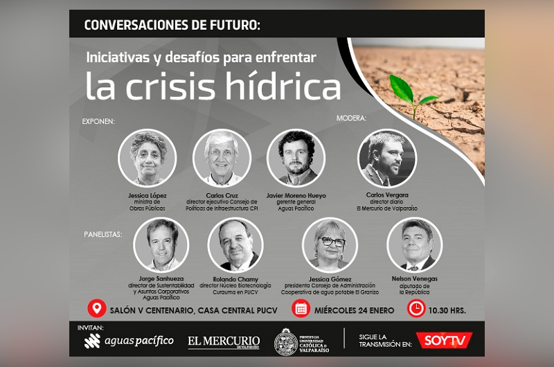 CPI – El Director Ejecutivo del Consejo de Políticas de Infraestructura (CPI), Carlos Cruz, participó como expositor, este miércoles 23 de enero, en el conversatorio “Iniciativas y desafíos para enfrentar la crisis hídrica”, organizado por la Pontificia Universidad Católica de Valparaíso, Aguas Pacífico y El Mercurio de Valparaíso.