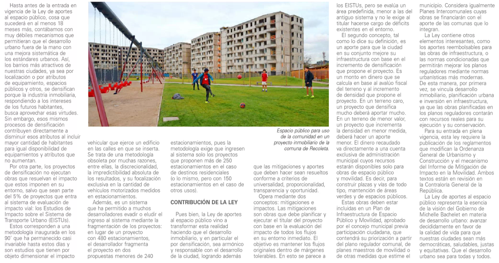 EL MERCURIO – Hasta antes de la entrada en vigencia de la Ley de aportes al espacio público, cosa que sucederá en al menos 18 meses más, contábamos con muy débiles mecanismos que permitieron que el desarrollo urbano fuera de la mano con una mejora sistemática de los estándares urbanos. Así, los barrios más atractivos de nuestras ciudades, ya sea por localización o por atributos de equipamiento, espacios públicos y otros, se densifican porque la industria inmobiliaria, respondiendo a los intereses de los futuros habitantes, busca aprovechar esas virtudes. Sin embargo, esos mismos procesos de densificación contribuyen directamente a disminuir esos atributos al incluir mayor cantidad de habitantes para igual disponibilidad de equipamientos y atributos que no aumentan.