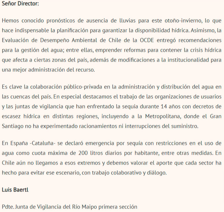 DIARIO FINANCIERO – Es clave la colaboración público-privada en la administración y distribución del agua en las cuencas del país