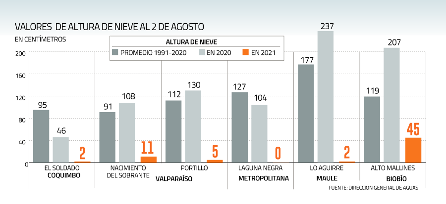 La altura nieve se mide en distintas estaciones entre las regiones de Coquimbo y Biobío. En Sobrante, que corresponde a la cuenca de Petorca en Valparaíso, alcanza -88%, y en Portillo es de -96%.