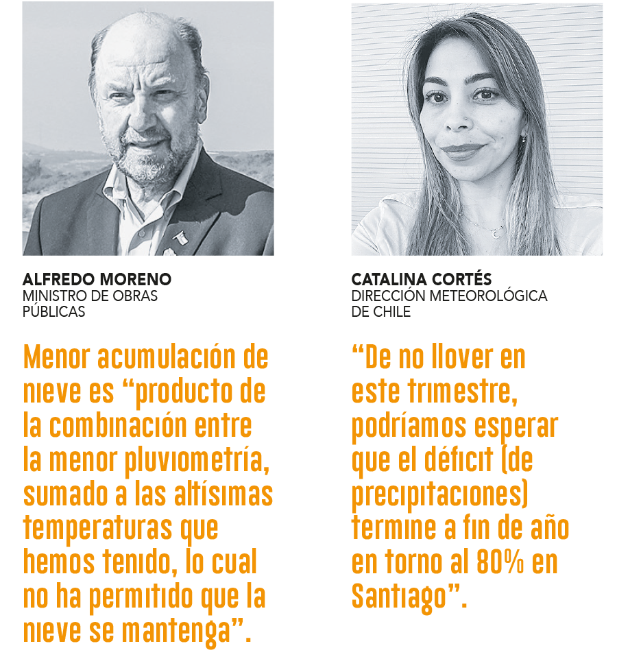 En tanto, el ministro de Obras Públicas, Alfredo Moreno, presentó este lunes datos de acumulación de nieve, donde se mide la superficie, y relató que los déficits son superiores al 85%. Destacó que en algunos lugares de la región de Coquimbo, incluso la baja es del 100%.