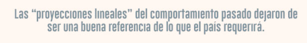 Dicho lo anterior, nuestra percepción es que los cambios que se avizoran no permiten pensar en la infraestructura del futuro de la misma manera con que se ha venido tratando el tema hasta ahora. Las “proyecciones lineales” del comportamiento pasado dejaron de ser una buena referencia de lo que el país requerirá. Debemos, entre todos, imaginar ese nuevo futuro y adecuar nuestras propuestas en el campo de la infraestructura a esa nueva realidad. Urgente desafío que deberá estar presente en las discusiones que tendrán lugar con motivo de las próximas elecciones presidenciales.