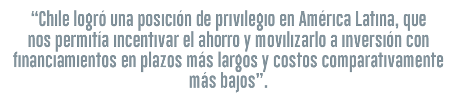Todos estos esfuerzos colocaron a Chile en una posición de privilegio en América Latina, que nos permitía incentivar el ahorro y movilizarlo a inversión con financiamientos en plazos más largos y costos comparativamente más bajos. Es así como se extendieron los plazos a 30 años de los créditos hipotecarios, con significativa competencia que permitió que las tasas de interés y los márgenes se redujeran, facilitando el acceso a financiamiento de la vivienda a sectores medios emergentes. En materia de financiamiento de proyectos de infraestructura, Chile logró financiar en moneda local a largo plazo concesiones de infraestructura por más de 10 mil millones de dólares, bajando el riesgo de descalce de plazos y tipo de cambio.