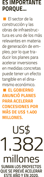 Para implementar el proceso de aceleración de inversión, uno de los primeros objetivos en la mira de la autoridad será generar las condiciones para eliminar el rezago habitual en la partida de los proyectos de infraestructura y asegurar el inicio de la mayor cantidad posible de estos en los primeros meses de 2020, implementando los respectivos llamados a licitación en el segundo semestre del presente ejercicio.