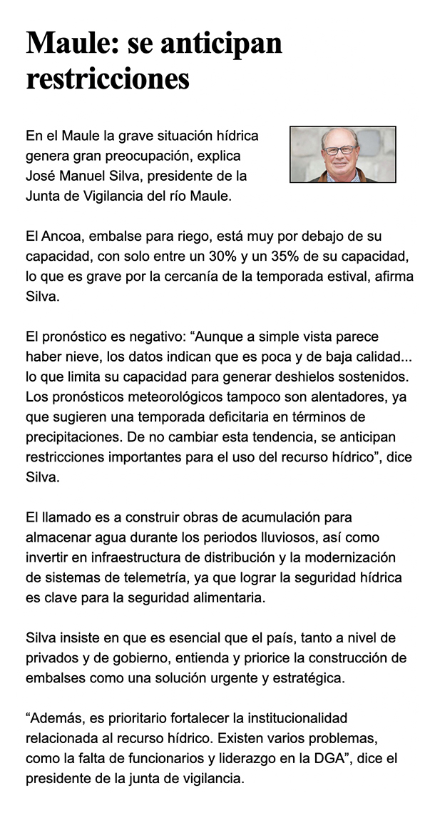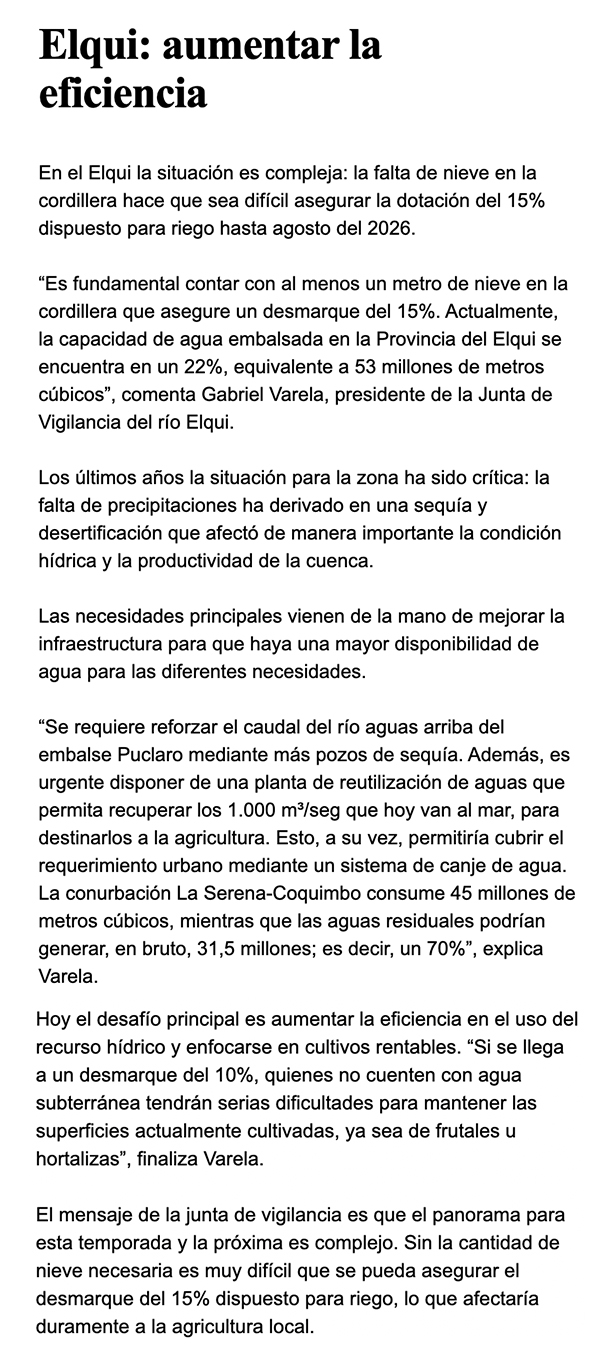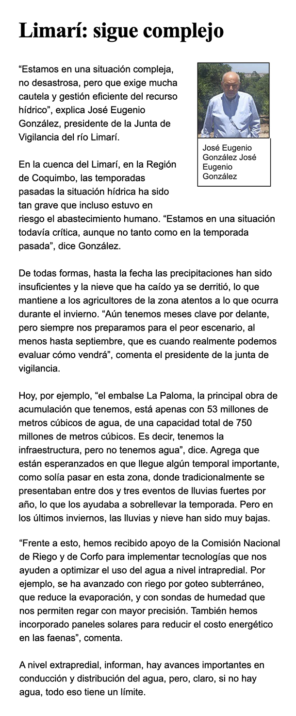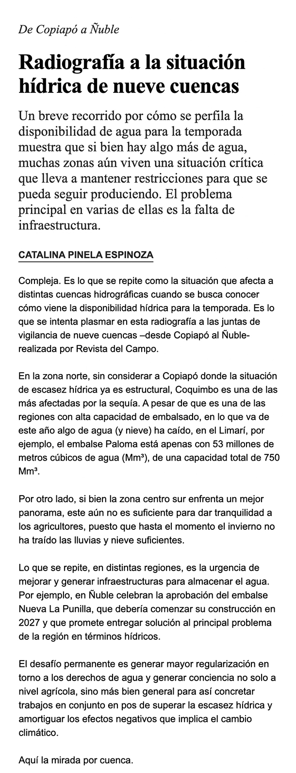 REVISTA DEL CAMPO – EL MERCURIO – Un breve recorrido por cómo se perfila la disponibilidad de agua para la temporada muestra que, si bien hay algo más de agua, muchas zonas aún viven una situación crítica que lleva a mantener restricciones para que se pueda seguir produciendo.