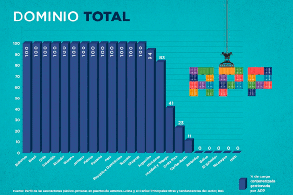 En todo el mundo, las APP han demostrado ser un modelo eficiente para adoptar las tendencias de “contenerización” de las cargas y solucionar las necesidades de infraestructura y operacionales. ALC no fue la excepción: en la actualidad, las APP constituyen la norma de las terminales portuarias de carga en contenedores y multipropósito. El 92% de los contenedores de 20 pies (TEU) de la región se trasladan desde y hacia puertos de APP, que representan el 83% de las terminales de contenedores de la región.