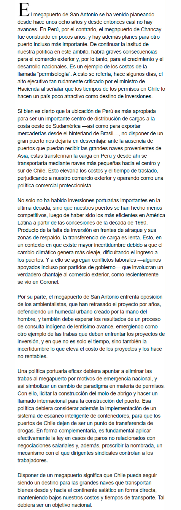 EL MERCURIO – De continuar la lasitud en este ámbito, habrá graves consecuencias para el comercio exterior y, por lo tanto, para el crecimiento y el desarrollo nacionales