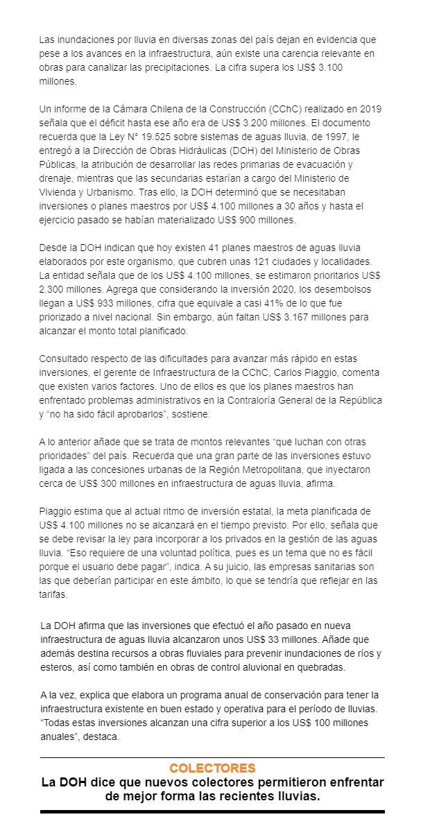 Noticias Déficit de inversiones en infraestructura para aguas lluvia supera los US$ 3.100 millones By Estefania Rodriguez Julio 7, 2020 0 790 Compartir WhatsAppLinkedinEmail EL MERCURIO – CChC plantea que se debe incorporar a empresas sanitarias en este ámbito. Fuente: El Mercurio, Martes 07 de Julio de 2020 olxslot EL MERCURIO – CChC plantea que se debe incorporar a empresas sanitarias en este ámbito. Fuente: El Mercurio, Martes 07 de Julio de 2020 olxslot Compartir WhatsAppLinkedinEmail Artículo anteriorMinistro Moreno y reactivación económica: "No solo incluye un plan de obras estatales sino que facilita la inversión y la actividad del sector privado"Artículo siguienteBiotrén: cuatro meses con un 70% menos de usuarios TITULARES La ausencia de la infraestructura en el debate presidencial de Chile Titulares Diciembre 5, 2025 SEA lanza Plan de Modernización Tecnológica que estrena Inteligencia Artificial en evaluación ambiental Titulares Diciembre 5, 2025 MOP inicia proceso de licitación para nueva concesión de autopista Los Libertadores Titulares Diciembre 5, 2025 Nuevo Puerto de San Antonio acumula casi 6 mil observaciones en cinco años Titulares Diciembre 5, 2025 Sistema de indicadores y estándares territoriales Titulares Diciembre 5, 2025 Estrategias territoriales por el derecho a la ciudad: campamentos en Temuco Titulares Diciembre 5, 2025
