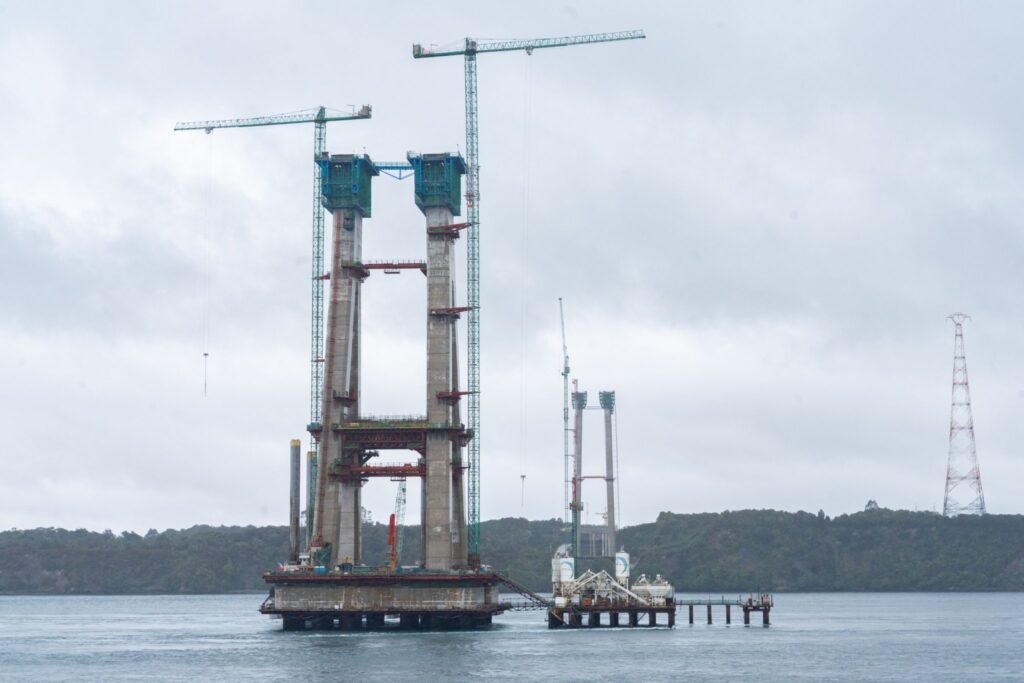 Detalló que, en la pila sur, en Chiloé, faltan solamente dos metros para lograr la altura máxima y estará lista antes de fin de año. A la pila norte, en tanto, que va a tener la más alta a 200 metros de altura sobre el nivel medio del mar, le faltan 10 metros, por lo que también se espera que esté terminada este año.
