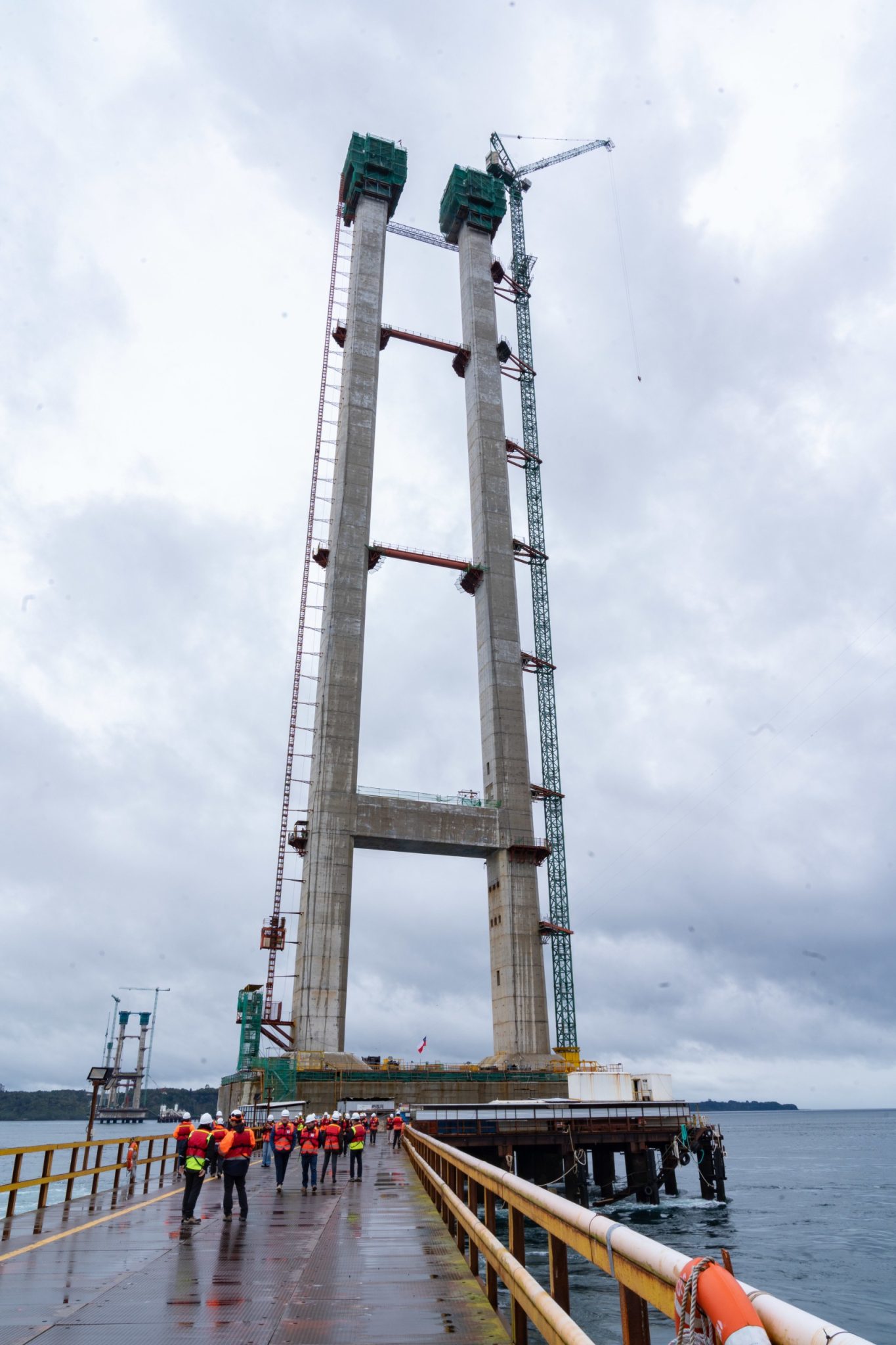 Detalló que, en la pila sur, en Chiloé, faltan solamente dos metros para lograr la altura máxima y estará lista antes de fin de año. A la pila norte, en tanto, que va a tener la más alta a 200 metros de altura sobre el nivel medio del mar, le faltan 10 metros, por lo que también se espera que esté terminada este año.