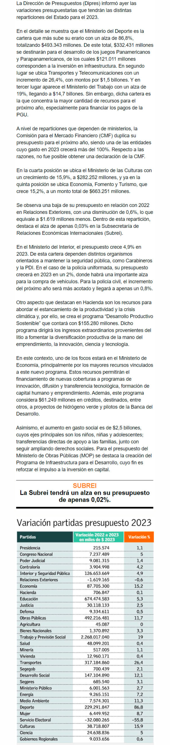 EL MERCURIO – El Ministerio del Deporte es la cartera que más sube su erario, con $121.011 millones que corresponden a inversión en infraestructura para el desarrollo de los juegos Panamericanos.
