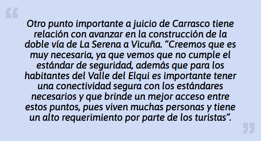 “Queremos que se construyan embalses y tranques, puentes, el túnel de Agua Negra u hospitales, pero que tengan una ruta concreta de lo que se debe hacer, ya que llevamos una década de falta de progreso y no queremos que vengan sólo a prometer sino que a proponer, sobre todo, respecto a las rutas 5 y 41 como se había planteado con anteriores ministros” añadió.