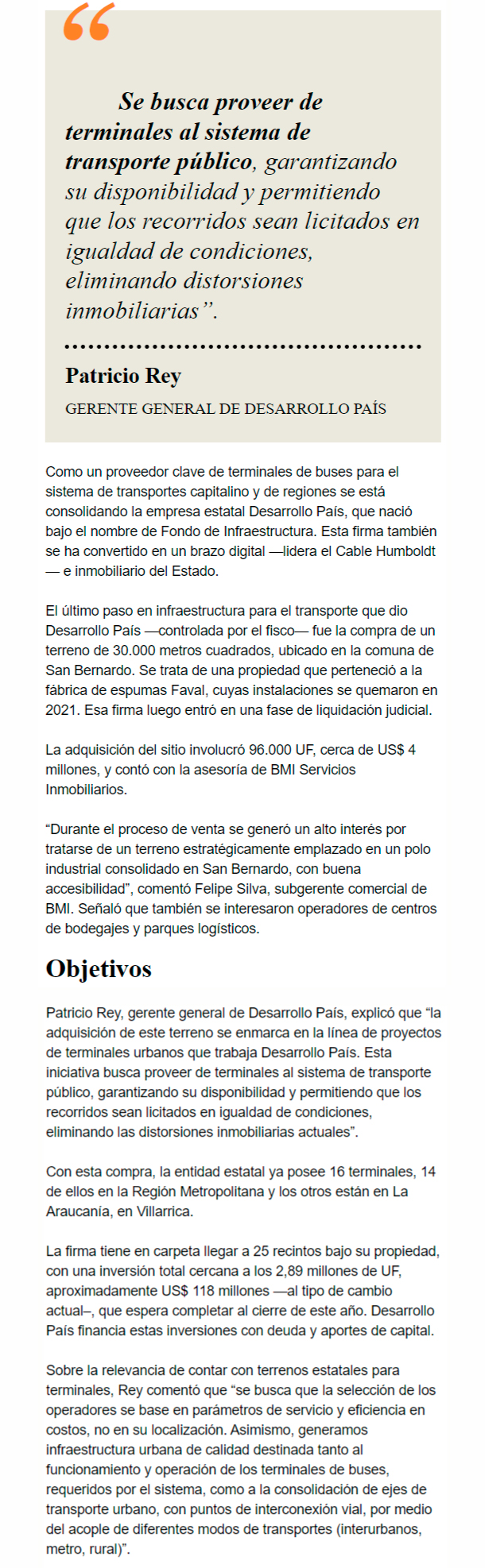 EL MERCURIO – La empresa estatal ya posee 16 recintos-de un total de 25 que pretende-,que estarán disponibles para el sistema de transportes de Santiago y regiones