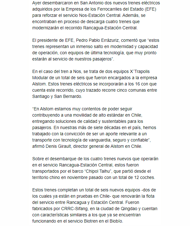 EL MERCURIO – Estos trenes representan un inmenso salto en modernidad y capacidad de operación, con equipos de última tecnología, que muy pronto estarán al servicio de nuestros pasajeros.