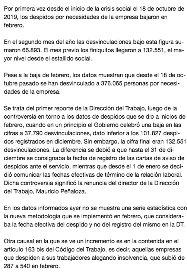 EL MERCURIO – En los datos informados ayer no se muestra una serie estadística con la nueva metodología que se implementó en febrero, que consideraba la fecha efectiva del despido