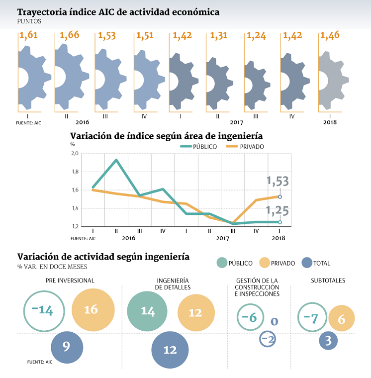 DIARIO FINANCIERO – Definitivamente, este año el país se apresta a dejar atrás el lento crecimiento en que se sumió desde fines de 2013. Así lo ratificó el Índice AIC de Actividad Económica que elabora la Asociación de Empresas Consultoras de Ingeniería, el cual en enero-marzo pasado puso fin a siete trimestres de persistentes caídas anuales.