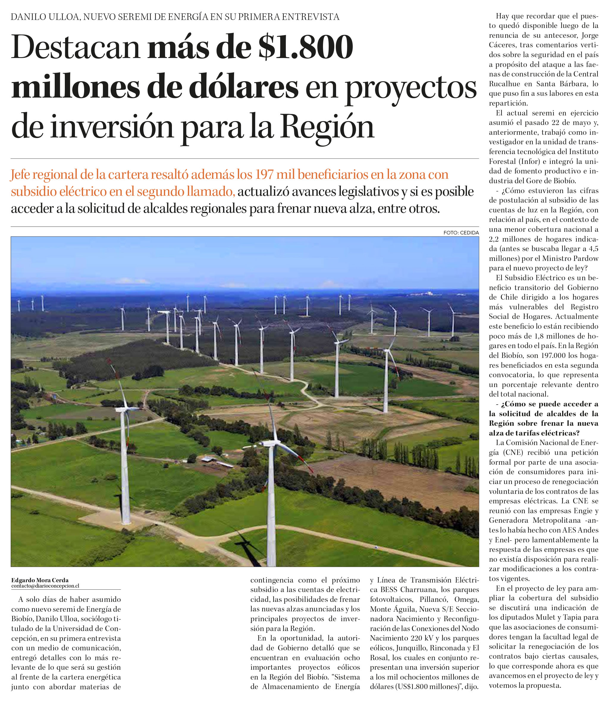 DIARIO CONCEPCIÓN – A solo días de haber asumido como nuevo seremi de Energía de Biobío, Danilo Ulloa, en su primera entrevista con un medio de comunicación, entregó detalles con lo más relevante de lo que será su gestión al frente de la cartera energética.
