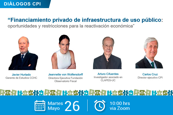 CPI – El próximo martes 26 de mayo se realizará el próximo Diálogo del CPI sobre “Financiamiento privado de infraestructura de uso público: oportunidades y restricciones para la reactivación económica” con la participación de Javier Hurtado, Gerente de Estudios de la CChC; Jeannette von Wolfersdorff, Directora Ejecutiva de la Fundación Observatorio Fiscal; y Arturo Cifuentes, Investigador Asociado en CLAPES-UC y la conducción de Carlos Cruz, Director Ejecutivo del CPI.