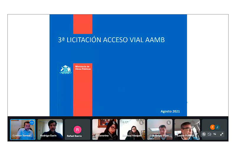 Continuando con las jornadas de difusión de los proyectos de concesiones en etapa de licitación, este jueves 19 de agosto se presentó la Tercera Concesión del Acceso Vial Aeropuerto Arturo Merino Benítez (AMB). La actividad, que fue desarrollada por videoconferencia, convocó a 14 representantes de cinco de las empresas que ya han comprado bases del proyecto que fue llamado a licitación el 19 de mayo pasado.