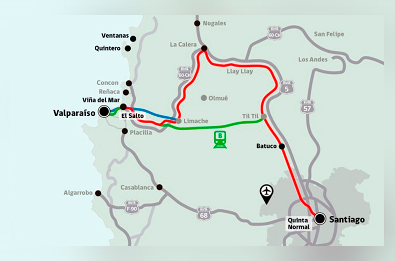 El proyecto Tren Valparaíso-Santiago contempla una inversión estimada de 3.820 millones de dólares y es parte de la cartera de licitaciones para 2025. El trazado del tren cruzará las comunas de Santiago, Quinta Normal, Renca, Quilicura, Lampa y Tiltil, en la Región Metropolitana, y Llay-Llay, Hijuelas, La Calera, La Cruz, Quillota, Limache, Villa Alemana, Quilpué, Viña del Mar y Valparaíso, en la Región de Valparaíso.