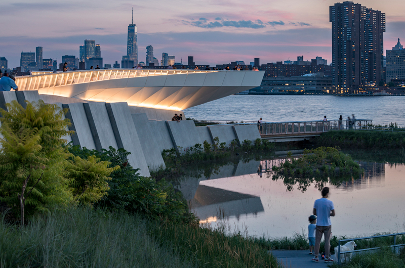 Little Island es un parque público que alberga tres nuevos espacios de presentación en el río Hudson. Diseñado como un refugio para las personas y la vida silvestre, este oasis verde está suspendido sobre el agua por escultóricas columnas y ubicado a un corto tramo del Lower West Side de Manhattan, por medio de una plataforma de madera. En contraste con las calles planas de Manhattan, el equipo de diseño quería crear una nueva topografía para la ciudad, que pudiera elevarse para dar forma a una variedad de espacios.