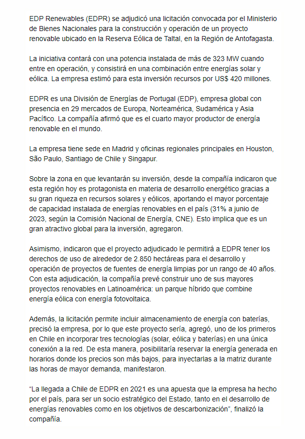 EL MERCURIO – Se trata de un parque híbrido que combinará energía eólica con fotovoltaica, tras adjudicarse un área de casi 3.000 hectáreas en el norte del país.