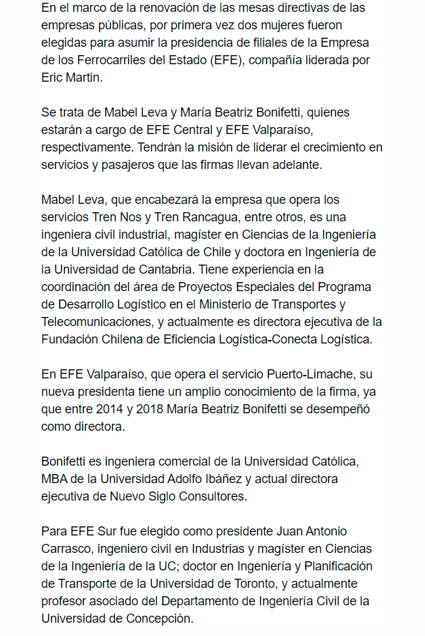 EL MERCURIO – Se trata de Mabel Leva y María Beatriz Bonifetti, quienes estarán a cargo de EFE Central y EFE Valparaíso, respectivamente.