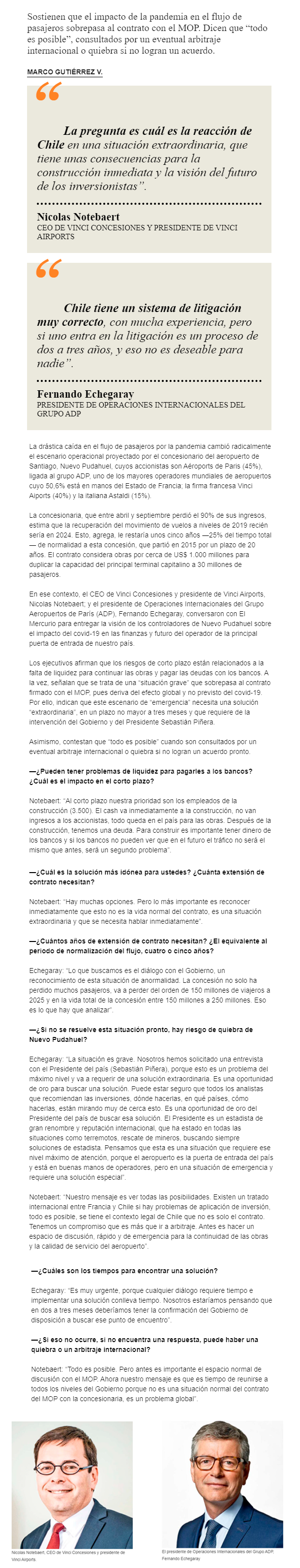 EL MERCURIO – Sostienen que el impacto de la pandemia en el flujo de pasajeros sobrepasa al contrato con el MOP. Dicen que “todo es posible”, consultados por un eventual arbitraje internacional o quiebra si no logran un acuerdo.