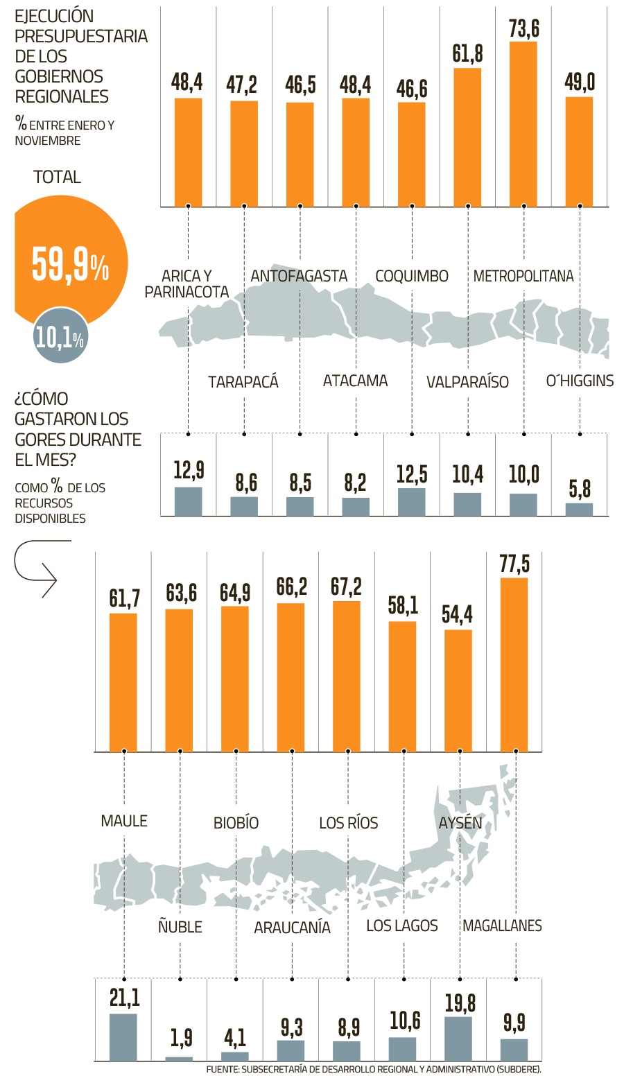 En el penúltimo mes del año, siete Gores tuvieron un gasto superior a los dobles dígitos. Aquí, destacó la región del Maule, que se gastó 21,1% de su erario para inversiones el mes pasado, muy por sobre el promedio de ejecución de 5,6% al mes que lleva en el año.