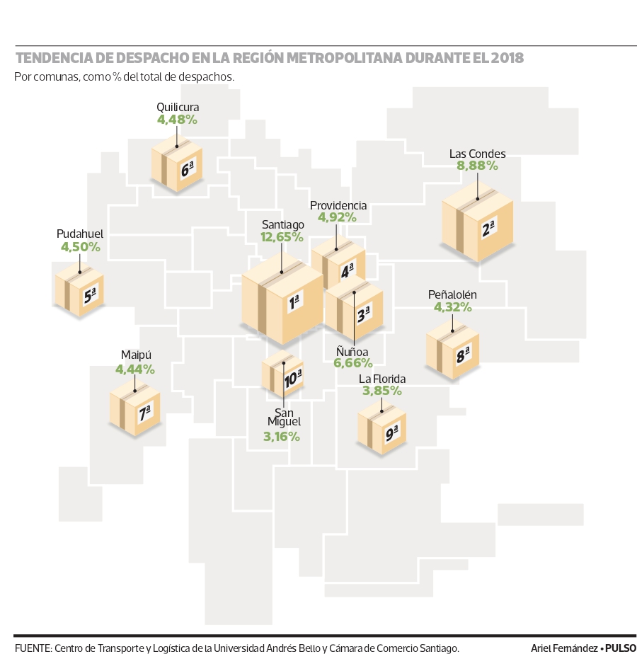 Según un estudio piloto de la CCS y la Universidad Andrés Bello, tomando como muestra a una empresa especializada en el rubro de entregas, durante el 2018, siete comunas concentraron el 46% de los despachos en la Región Metropolitana (ver gráfico) y el peak de entregas se produce entre las 11.00 y 15.00 hrs, siendo el sábado el día con mayor cantidad de despachos.