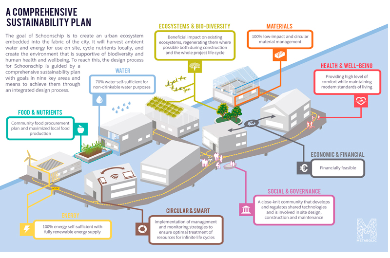 Uno de los proyectos más destacados de la empresa e impulsado por la comunidad, es Schoonschip, un barrio circular innovador en Ámsterdam. Hogar de más de 100 residentes, el proyecto cuenta con sistemas de energía, agua y residuos descentralizados y sostenibles. Una red inteligente de paneles solares ayuda a los residentes a intercambiar energía entre ellos, mientras que las tecnologías de tratamiento de agua recuperan energía y nutrientes de las aguas residuales. La comunidad de propietarios ha querido compartir la información acumulada durante el desarrollo del plan, por lo que el proyecto es de código abierto. El conocimiento que se utilizó para crear el desarrollo residencial se compiló en un sitio web que detalla varios aspectos, desde materiales hasta producción de alimentos y aspectos legales.