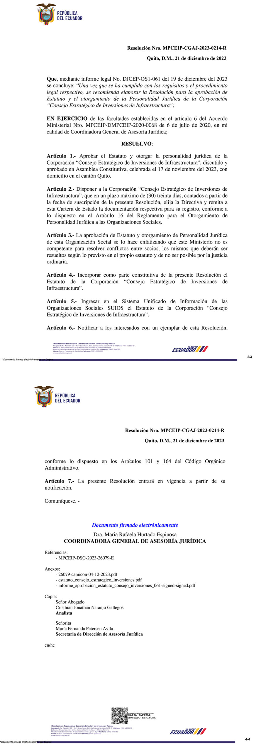 MINISTERIO DE PRODUCCIÓN, COMERCIO EXTERIOR, INVERSIONES Y PESCA – REPÚBLICA DEL ECUADOR – Resuelvo: Aprobar el Estatuto y otorgar la personalidad jurídica de la Corporación “Consejo Estratégico de Inversiones de Infraestructura”.