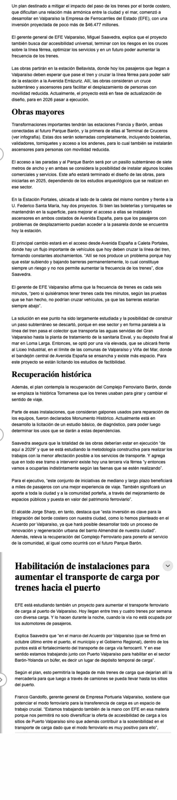 EL MERCURIO – Cinco iniciativas que están en diferentes etapas de consolidación contemplan, además, la instalación de ascensores y la construcción de una vía elevada para ingresar a Caleta Portales. También se proyecta recuperar el complejo Ferroviario Barón.