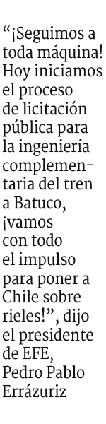 “¡Seguimos a toda máquina! Hoy iniciamos el proceso de licitación pública para la ingeniería complementaria del tren a Batuco, ¡vamos con todo el impulso para poner a Chile sobre rieles!”, dijo el presidente de EFE, Pedro Pablo Errázuriz, a través de Twitter y al ser consultado agregó que “hemos ido avanzando nuestro proceso en el SEIA y por eso estamos licitando para poder completar nuestro estudio, con la esperanza de tener aprobado el Estudio de Impacto Ambiental en primer semestre de 2020 y partir con obras a fines de ese año o en 2021”.