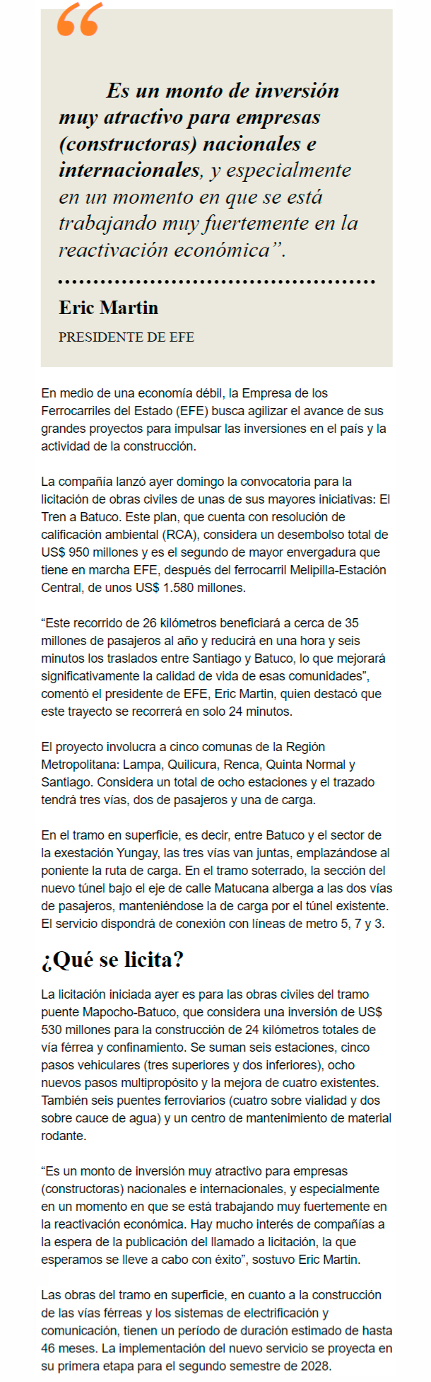 EL MERCURIO – La iniciativa involucra a cinco comunas de la Región Metropolitana, ocho estaciones, vías para pasajeros y carga, y tendrá conexiones con el metro. El contrato partiría a fines de 2024.