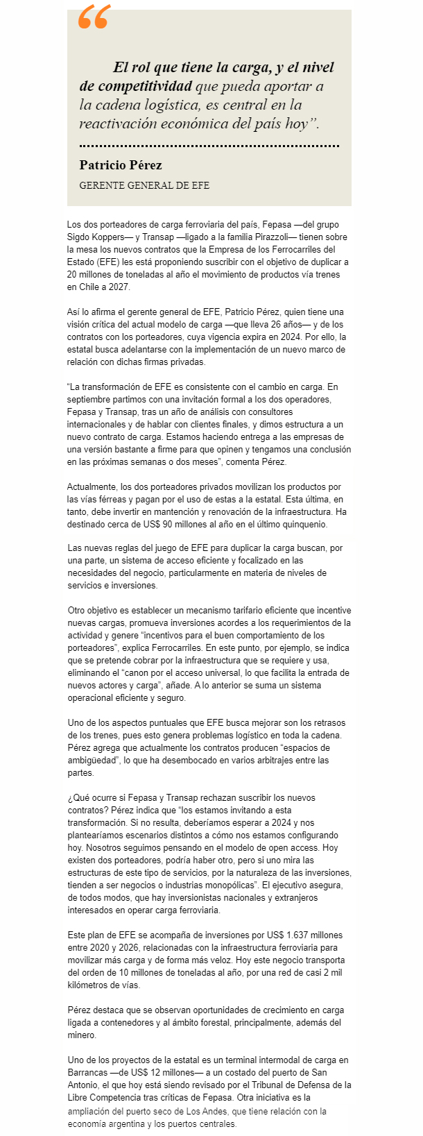 EL MERCURIO – El vínculo actual de Ferrocarriles dell Estado con los porteadores privados ligados Sigdo Koppers y familia Pirazzoli termina en 2024.