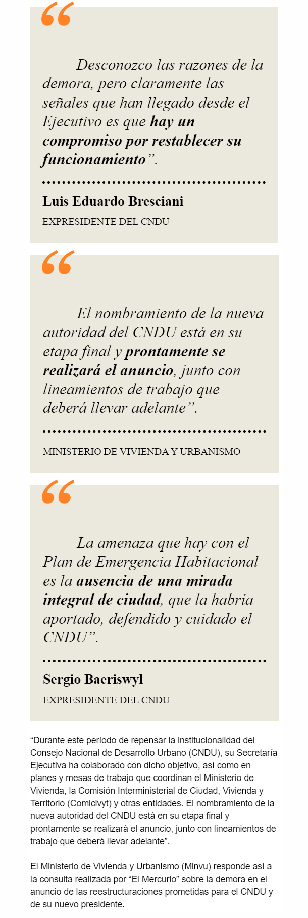 EL MERCURIO – Quien lo lideraba hasta entonces, Sergio Baeriswyl, lamenta que “las ciudades están enmudecidas”. Minvu afirma que la Secretaría Ejecutiva ha participado en ciertas instancias.