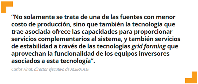 “No solamente se trata de una de las fuentes con menor costo de producción, sino que también la tecnología que trae asociada ofrece las capacidades para proporcionar servicios complementarios al sistema, y también servicios de estabilidad a través de las tecnologías grid forming que aprovechan la funcionalidad de los equipos inversores asociados a esta tecnología. (…) También es importante destacar que la disponibilidad de energía eléctrica a muy bajo costo, como es el caso de la fotovoltaica y la eólica, es fundamental para la incorporación de sistemas de almacenamiento de energía, que puedan ser cargados cuando se dispone del recurso primario, sol en el caso de la fotovoltaica, para contar con energía en las horas en que dicho recurso primario no está disponible”, señala Finat.