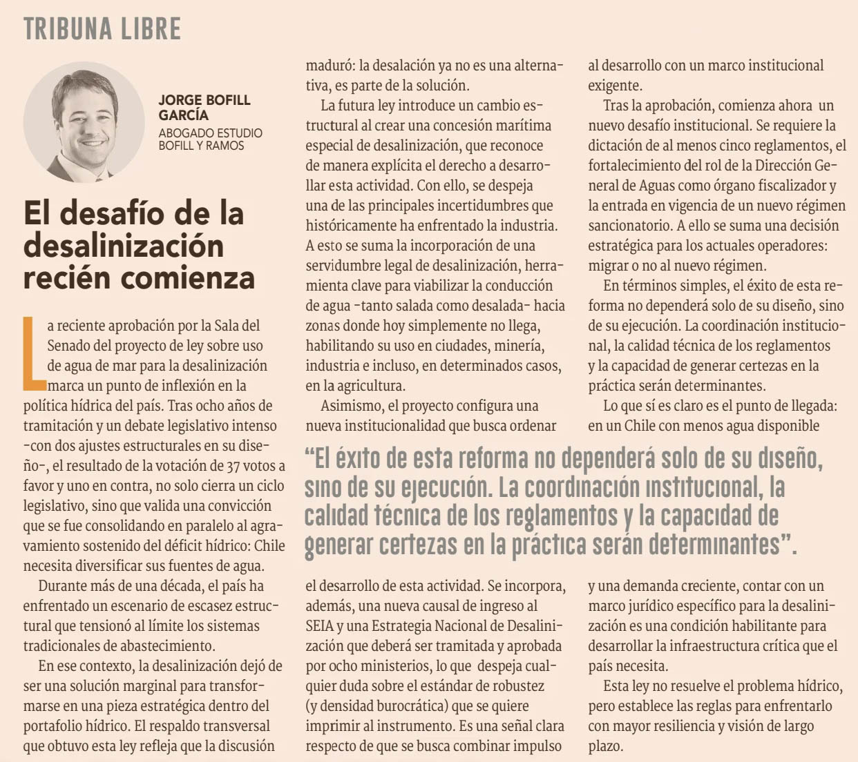 El desafío de la desalinización recién comienza por Jorge Bofill G.