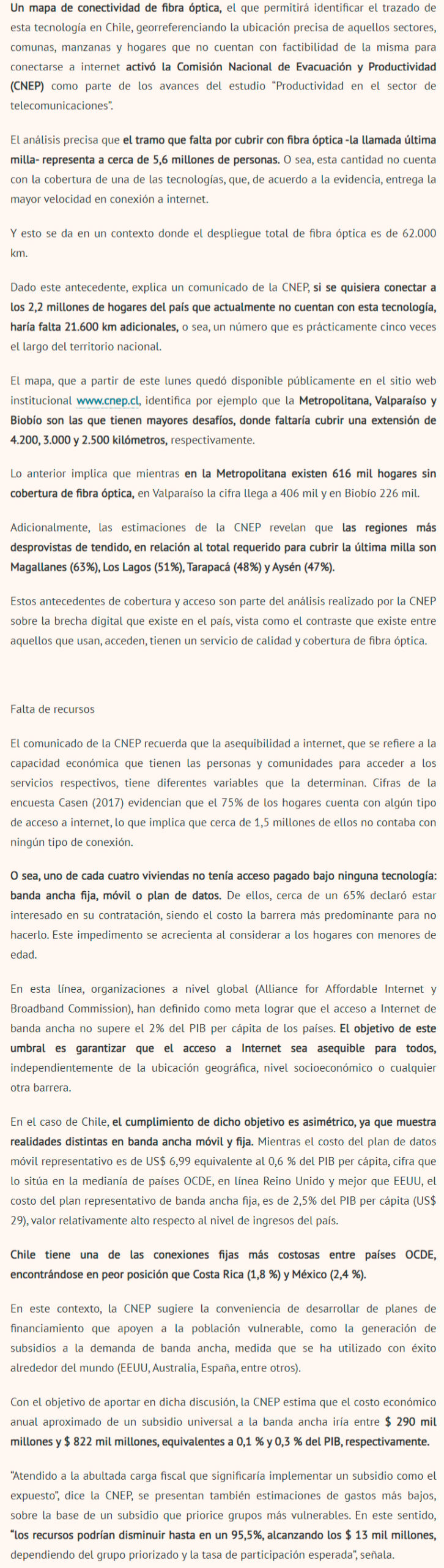 DIARIO FINANCIERO – El análisis precisa que el tramo que falta por cubrir con fibra óptica -la llamada última milla- representa a cerca de 5,6 millones de personas.