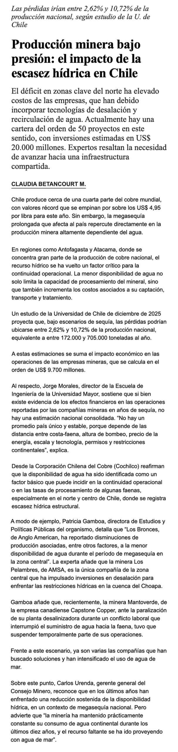 El impacto de la escasez hídrica en Chile en la producción minera