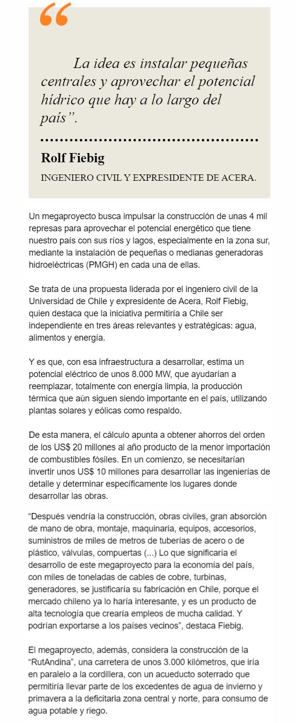 EL MERCURIO – Se trata de instalar más de 4 mil represas en lagos y ríos que hay en el país para generar energía renovable y transportar agua hacia el norte.