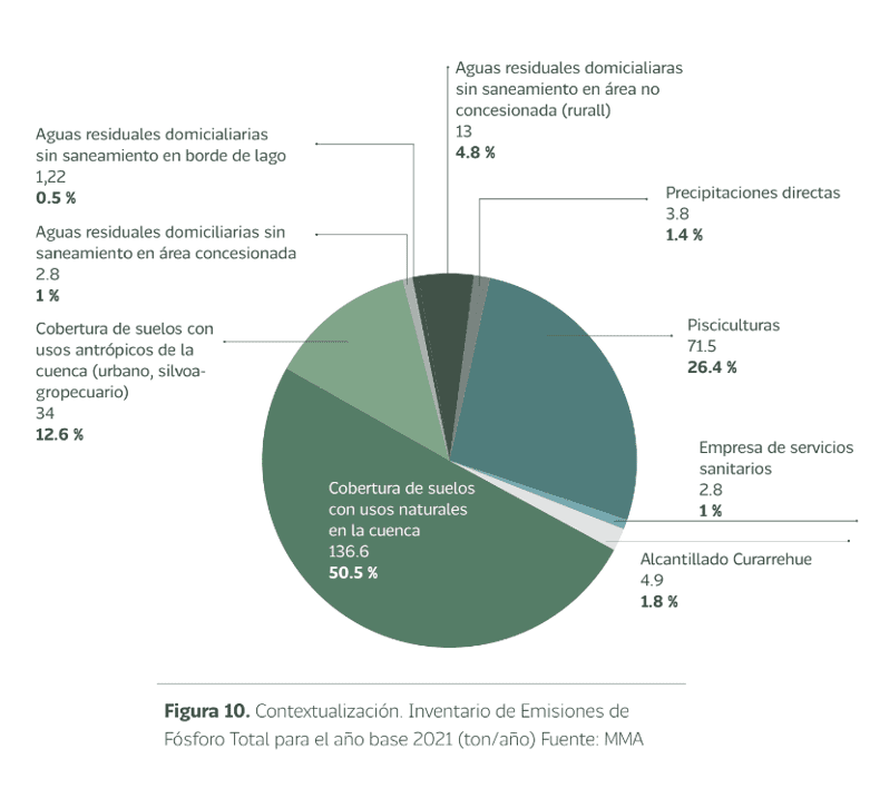Otra consideración vital es justamente esa elaboración de un inventario de emisiones por fósforo total vertido al lago. En Villarrica, por ejemplo, se logró determinar en porcentajes cuáles son los aportes de las fuentes fijas y difusas en fósforo que contribuyen a la superación de las normas secundarias. Eso sí, un 50,5% de la contribución a la contaminación por fósforo obedece a “la cobertura de suelos con usos naturales en la cuenca”; esto es, por factores naturales. Pero dentro de los factores antrópicos, aparecen en primer lugar las pisciculturas presentes en la cuenca, que representan el 26% del aporte en fósforo. Los otros porcentajes consignados en el inventario son: cobertura de suelos con usos antrópicos en la cuenca (12,6%), aguas residuales domiciliarias sin saneamiento en área no concesionada-rural (4,8%), alcantarillado Curarrehue (1,8%), precipitaciones directas (1,4%, también a causa de factores naturales), aguas residuales domiciliarias sin saneamiento en área concesionada (1%), empresa de servicios sanitarios (1%) y aguas residuales domiciliarias sin saneamiento en borde de lago (0,5%). Un ejemplo similar de inventario podría extrapolarse al Maipo.