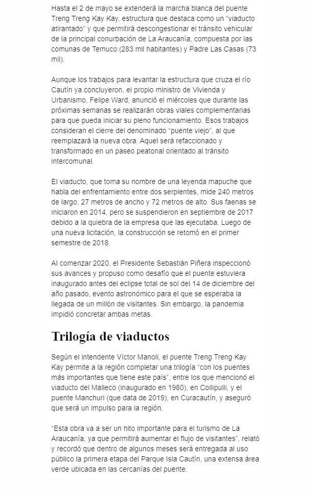 EL MERCURIO – Aunque construcción del viaducto que une a Temuco y Padre las Casas concluyó, faltan obras viales para su pleno funcionamiento.