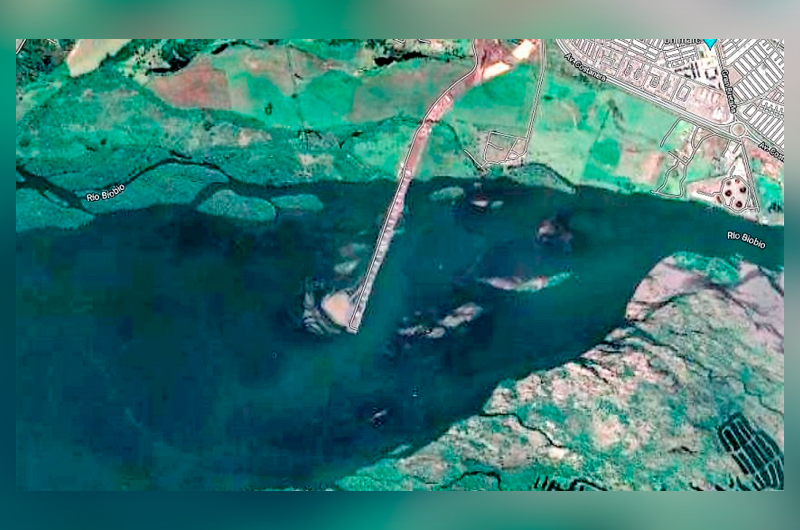 De manera silenciosa y con rapidez el nuevo viaducto ha ido tomando forma y como se puede apreciar en la imagen central, rescatada desde la aplicación Google Maps, el tramo del puente que va desde la ribera norte, en Hualpén, ya suma mil metros, faltando otros mil para llegar a la ribera sur, en San Pedro de la Paz.