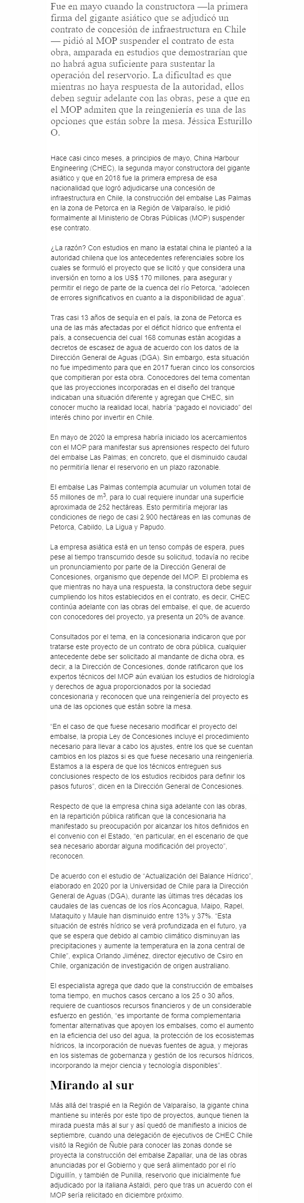 EL MERCURIO – La primera firma del gigante asiático pidió al MOP suspender el contrato de esta obra, amparada en estudios que demostrarían que no habrá agua suficiente para sustentar la operación del reservorio.