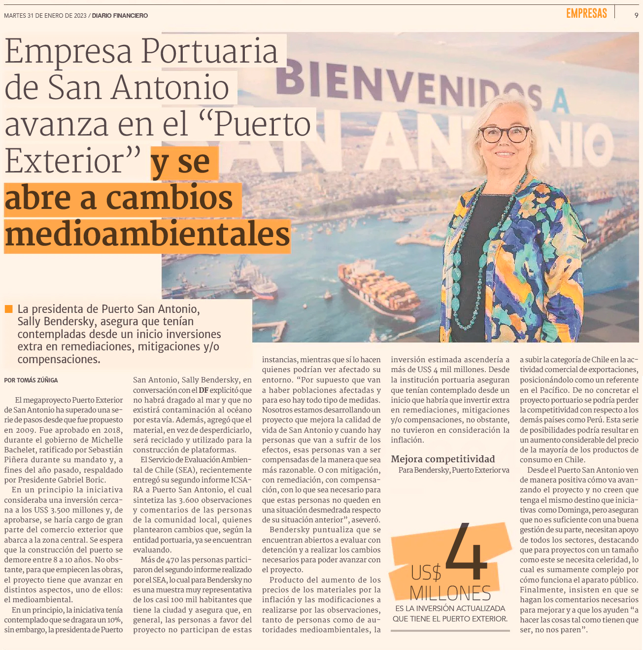 DIARIO FINANCIERO – La presidenta de Puerto San Antonio, Sally Bendersky, asegura que tenían contempladas desde un inicio inversiones extra en remediaciones, mitigaciones y/o compensaciones.