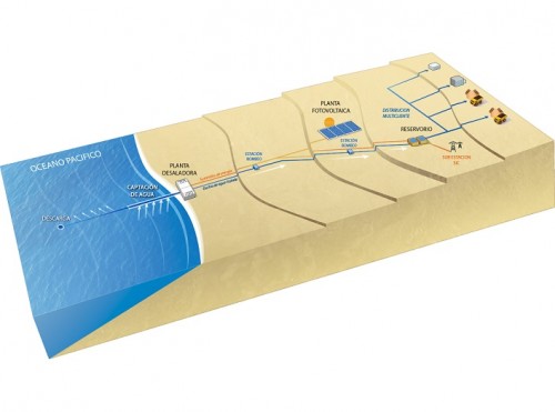 Este megaproyecto, cuya inversión total es de US$500 millones, contempla una planta desaladora autosustentable entre Caldera y Copiapó, con una capacidad promedio de 1.000 litros por segundo de agua desalinizada de calidad industrial.