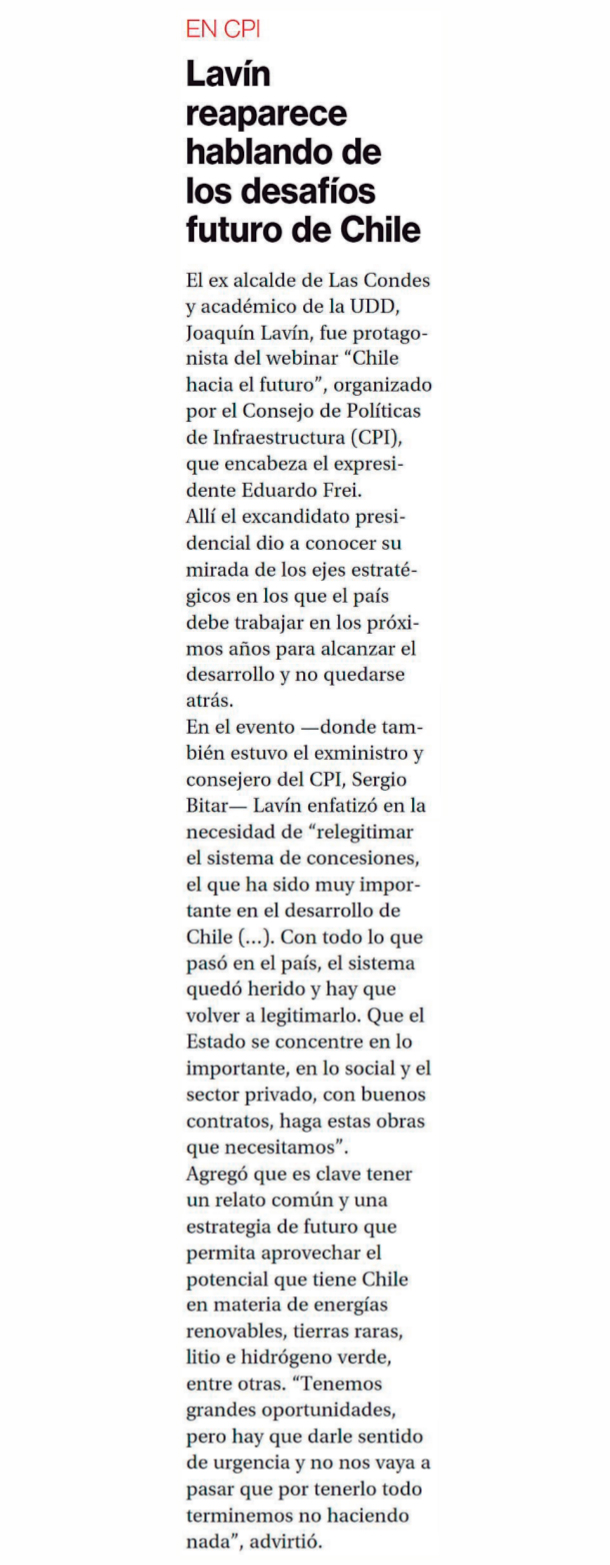 LA SEGUNDA – Lavín enfatizó la necesidad de “relegitimar el sistema de concesiones, el que ha sido muy importante en el desarrollo de Chile”.